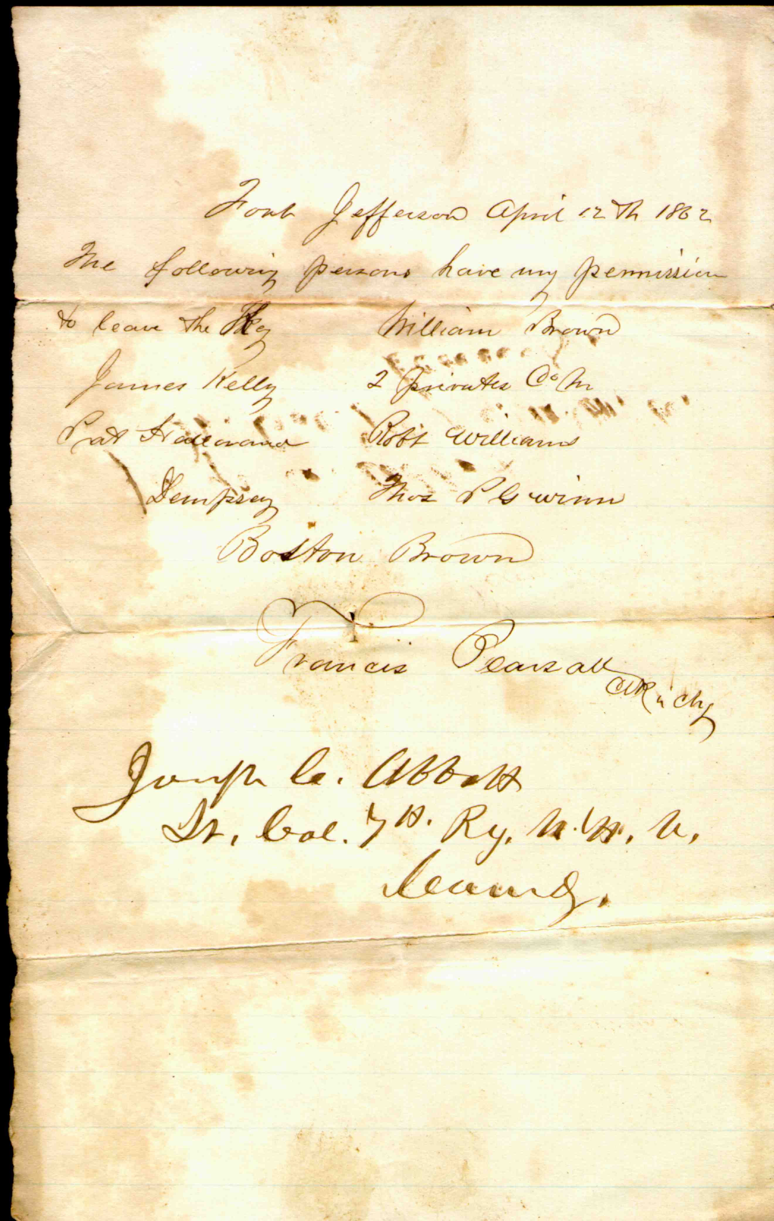 | Francis Pearsall – clk. in chrg (Signed) Joseph C. Abbott Lt. Col. 7th Ry. N. H. V. (7th Regiment, New Hampshire Volunteers) |